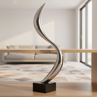 This abstract stainless steel sculpture is a masterpiece of modern metal art, designed to elevate the aesthetic of both indoor and outdoor space. Crafted from stainless steel with a mirror polished finish, it boasts a sleek, reflective surface that catches light and creates a dynamic visual effect. Suitable for living room, lobbies. This sculpture can be fully customized in size and finish to match your design vision.